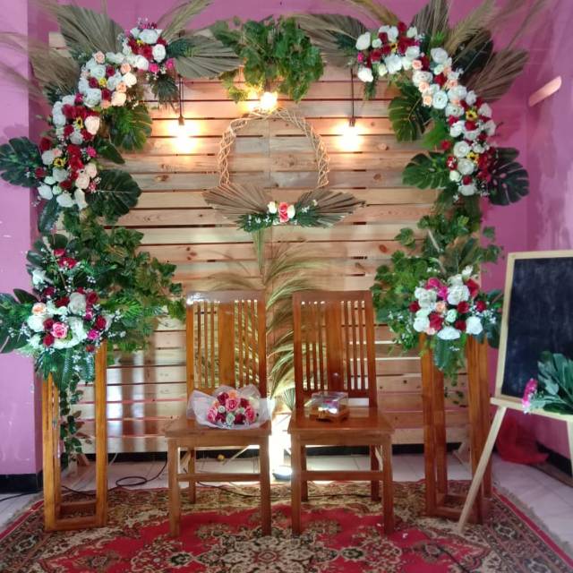 Jika anda butuh backdrop nikahan,lamaran dengan nuansa cantik dari bunga kain dan daun maka pilih backdrop lamaran.